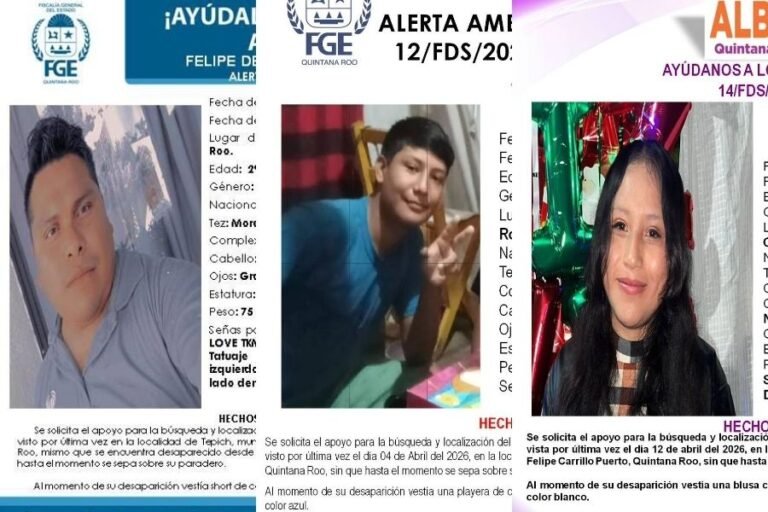 En el primer caso, la FGE Quintana Roo activó la ficha de búsqueda de Felipe de Jesús Che Tuyub de 29 años, visto por última vez el martes 3 de marzo de 2026, en la localidad de Tepich; el segundo caso, es el del menor José Alberto May Pat de 15 años, visto por última vez el sábado 4 de abril de 2026, en la localidad de Señor; el tercer caso es el de Mari Flor May Caamal de 19 años, vista por última vez el domingo 12 de abril de 2026.