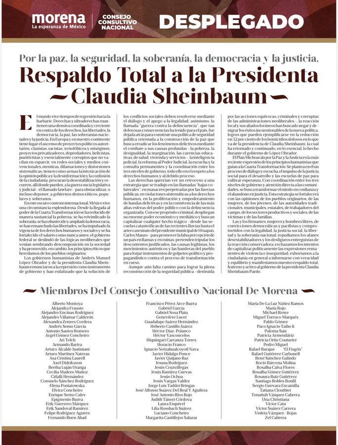 CIUDAD DE MÉXICO.- El Consejo Consultivo de Morena expresó este domingo su “respaldo total a la presidenta Claudia Sheinbaum Pardo”, y destacar el Plan Michoacán por la Paz y la Justicia, recalcaron que “las derechas querían ver un retroceso a una estrategia que se tradujo en las llamadas ‘bajas colaterales’, en masacres perpetradas por las fuerzas públicas, en violaciones sistemáticas a los derechos humanos, en la proliferación y empoderamiento de bandas delictivas”.