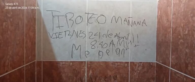 Según información extraoficial, fue antes de finalizar el turno matutino cuando se informó al personal docente sobre una tira de papel que estaba pegada en la pared del baño de hombres, con amenaza de ataque a balazos mañana.