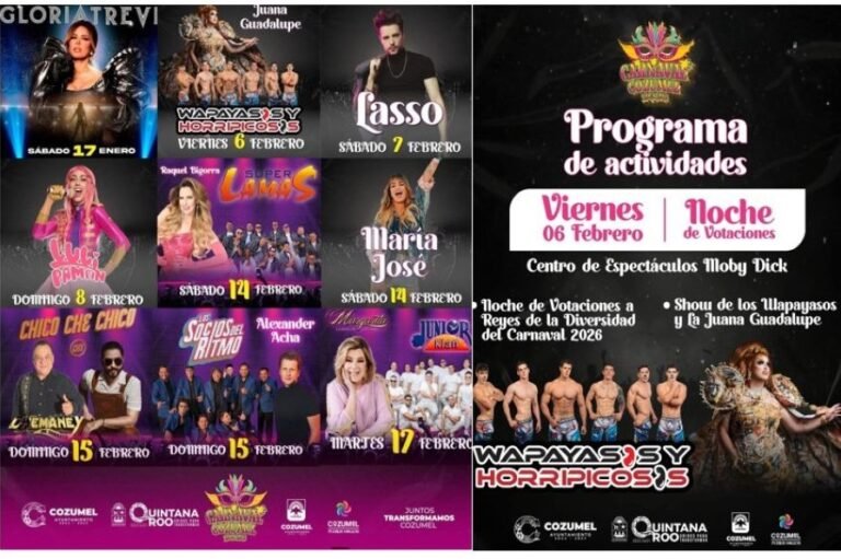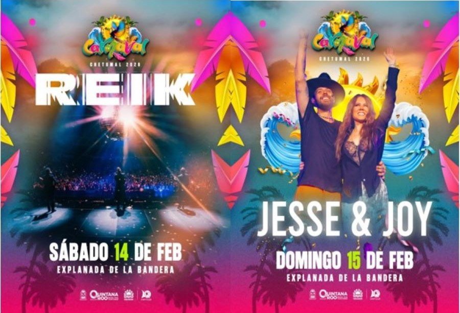 Chetumal celebrará el Carnaval 2026 del 12 al 17 de febrero. El jueves estará Nelson Kanzela, el viernes Banda Limón, el sábado Reik, el domingo Jesse & Joy, El Malilla. Tulum iniciará su carnaval el 23 de febrero con La original Sonora Dinamita, el sábado 24 con Tierra Sagrada.