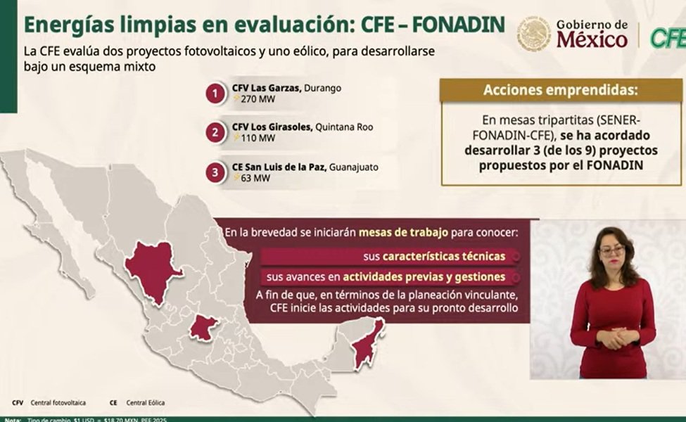 “Un bloque de proyectos que se encuentran en evaluación conjuntan CFE con Fonadin (Fondo Nacional de Infraestructura), bajo un esquema de coordinación institucional, son tres proyectos de energía limpias, dos fotovoltaicos y uno eólico, ubicados en los estados de Durango, Quintana Roo y Guanajuato. Tienen una capacidad conjunta, los tres, de 443 Megawatts”, enfatizó Calleja Alor.