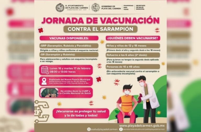 PLAYA DEL CARMEN.- Con el objetivo de proteger la salud de las y los playenses, el gobierno de la presidenta Estefanía Mercado, convocó a la población, por conducto de la Secretaría de Salud municipal, a participar en la jornada de vacunación contra el Sarampión, que se llevará a cabo los días 16 y 17 de febrero, de las 8 de la mañana a la 1 de la tarde, en la explanada del Nuevo Palacio Municipal.