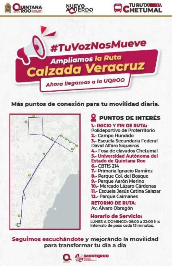 CHETUMAL.- En una acción histórica para la movilidad urbana y el acceso a la educación en la capital del estado, la gobernadora Mara Lezama Espinosa dio a conocer que el próximo lunes 16 de febrero inicia la nueva ruta piloto de transporte público “4 de Marzo” que recorrerá 42 colonias de la ciudad y se amplía la ruta Calzada Veracruz hasta la Universidad Autónoma de Quintana Roo (Uqroo), integrando por primera vez a la máxima casa de estudios del estado a un esquema formal de transporte urbano.