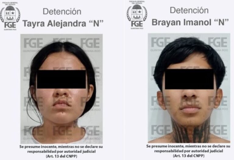 CANCÚN.- La Fiscalía General del Estado informa la captura de dos personas identificadas como Tayra Alejandra “N” y Brayan Imanol “N”, por hechos probablemente constitutivos del delito de feminicidio en agravio de una víctima de identidad reservada.