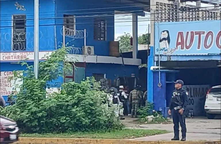 El primer operativo de cateo se observó, en una chatarrera ubicada en la colonia Jardines, sobre la avenida Bugambilias, a pocos metros del mercado Andrés Quintana Roo, con el apoyo perimetral de la Secretaría de la Defensa Nacional (Sedena), Guardia Nacional y Secretaría de Marina (Semar), mientras elementos de la Policía Estatal y Policía Municipal y de la FGE ingresaron al predio.