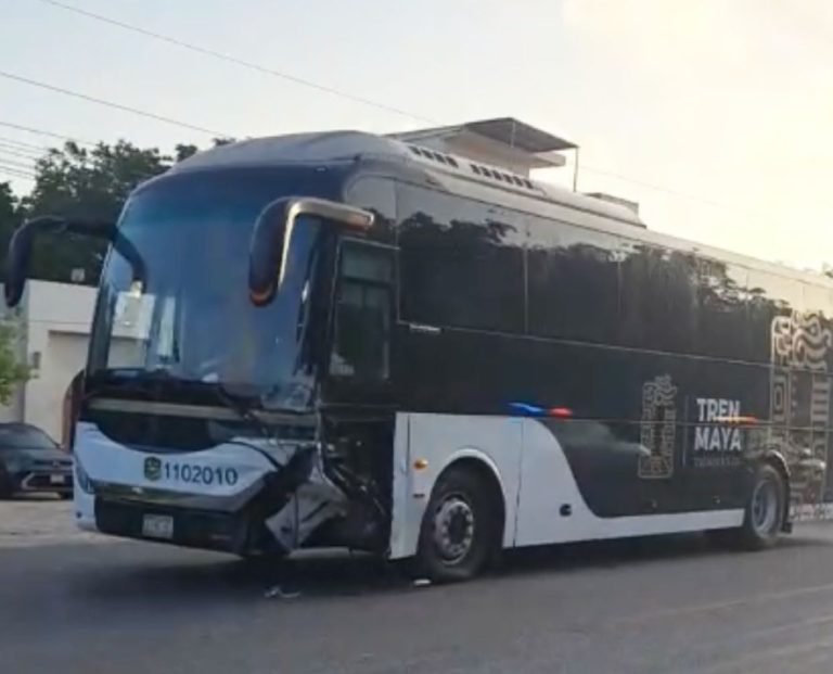 TULUM- Un autobús del Tren Maya, cuyo chofer se dio a la fuga, protagonizó esta mañana un aparatoso accidente carretero con una lujosa camioneta BMW, en la entrada sur de la ciudad de Tulum.