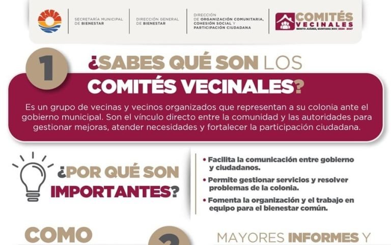 CANCÚN.- Autoridades del Ayuntamiento de Benito Juárez, mediante la Secretaría Municipal de Bienestar, invitan a las y los ciudadanos a participar en la convocatoria para la elección de los Comités Vecinales para el periodo 2024-2027, cuyo registro se encuentra vigente hasta el 21 de marzo.