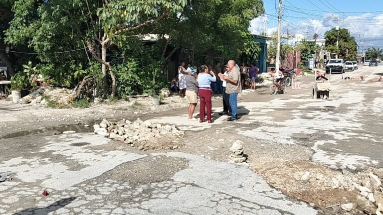 Desde las 10 de la mañana, exhiben cartelones exigiendo la inmediata reparación de sus vialidades y mantienen cerrada la arteria principal que conecta las regiones 225, 226, 227 y avenida Kabah.