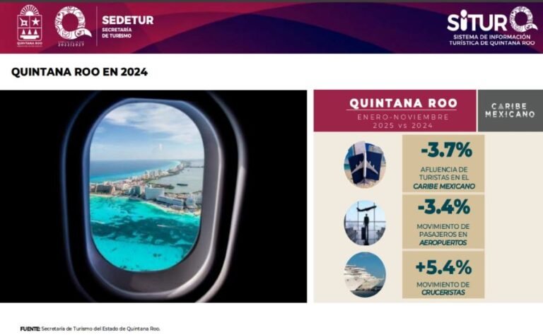 CANCÚN.- En su último reporte de “¿Cómo vamos?” de la Secretaría de Turismo del Gobierno del Estado, “en el periodo enero-noviembre de 2025 se observa un descenso de 3.7% en la afluencia turística en comparación con el mismo periodo de 2024, lo que representa un total de 18 millones 232, mil 059 turistas en el Caribe Mexicano”.