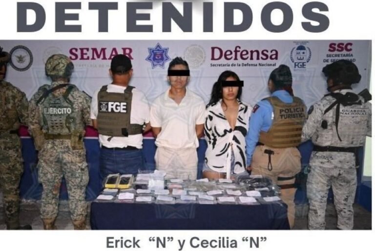 Los detenidos fueron identificados como Erick “N”, de 28 años, y Cecilia “N”, de 22 años, quienes fueron puestos a disposición de la Fiscalía General del Estado (FGE) para el inicio de las investigaciones y la definición de su situación jurídica.
