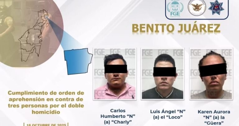 CANCÚN.- Tres personas fueron detenidas por su presunta participación en el homicidio de una pareja ocurrido el pasado 13 de octubre en el fraccionamiento Vista Real, en Cancún, donde las víctimas fueron asesinadas frente a sus hijos.