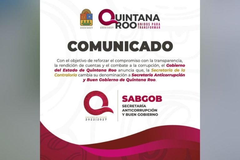 CHETUMAL.- Con el objetivo de reforzar el compromiso con la transparencia, la rendición de cuentas y el combate a la corrupción, el Gobierno del Estado anuncia que, la Secretaría de la Contraloría cambia su denominación a Secretaría Anticorrupción y Buen Gobierno de Quintana Roo (SABGOB ).