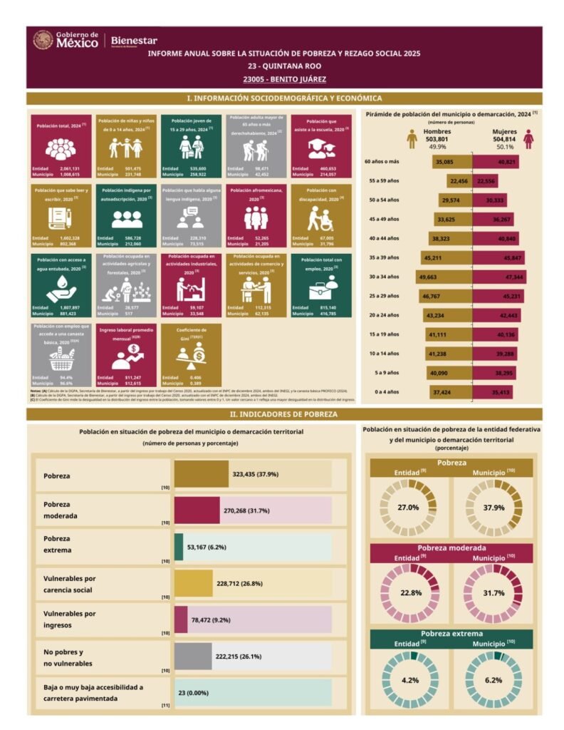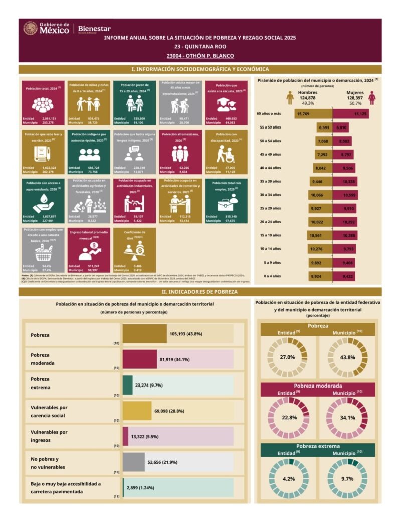 Los datos de la Secretaría del Bienestar del Gobierno de México detallan que en Cozumel la pobreza alcanzó a 28 mil 993 personas en 2025, es decir, e l 39.6% de la población; en Felipe Carrillo Puerto 86 mil 771 habitantes declaran ser pobres, representa el 81.1%; en Isla Mujeres, 9 mil 106 personas están en esa condición, o sea el 50.3% de la población del Municipio; la pobreza en Othón P. Blanco alcanzó a 105 mil 193 personas (43.8%); Benito Juárez (Cancún) tiene 323 mil 435 pobres (37.9%); José María Morelos acumuló en este 2025 a 43 mil 423 pobres, el 80.8% de su población; Lázaro Cárdenas, 23 mil 508 pobres (65.7%); Playa del Carmen tiene 114 mil 940 personas en pobreza, un 37.3% de los que viven en la demarcación; Tulum, con todos sus problemas tiene 28 mil 542 pobres (61.8%); Bacalar, suma 37 mil 312 pobres, un 73.5% de su población y; Puerto Morelos tiene a 10 mil 912 pobres, el 42.7% de sus habitantes.