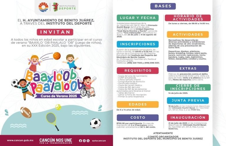 “En esta vacaciones de verano corre, juega y diviértete en el ‘Baaxlo’ob Paalalo’ob’. Atención niñas, niños y jóvenes que sueñan con convertirse en grandes deportistas, ya viene este evento del 25 de julio al 8 de agosto para 500 chiquitines entre 6 y 14 años con un costo de recuperación mínima”, informó la Primera Autoridad Municipal.