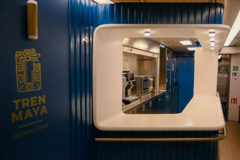 Los pasajeros abordarán el tren “El Expreso de Año Nuevo” en la estación de Cancún-Aeropuerto. El diseño del transporte ferroviario fue inspirado en la Grandeza Maya; “P’atal (Permanecer), con tres trenes que ofrecerán una experiencia para viajes largos y que se viste en tonalidades nocturnas que hacen alusión a la noche estrellada que los mayas clásicos estudiaron en su faceta de astrónomos.