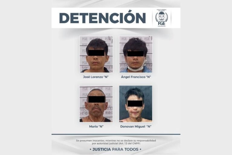 TULUM.- Cuatro presuntos integrantes del Cártel Jalisco Nueva Generación (CJNG) fueron detenidos durante un operativo conjunto realizado por la Fiscalía General del Estado (FGE), elementos de la Secretaría de la Defensa Nacional (Defensa) y la Policía Municipal de Tulum.