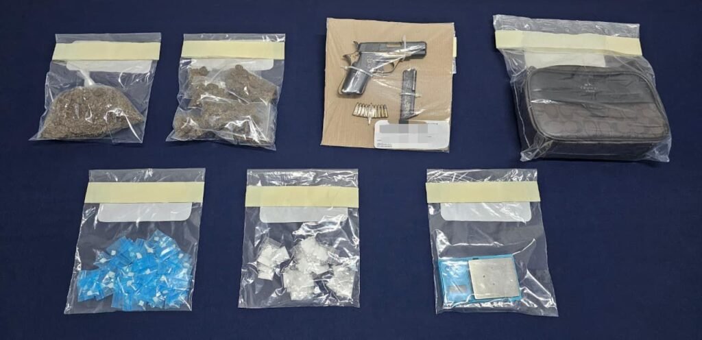 Durante la revisión preventiva, los oficiales aseguraron seis bolsitas y una bolsa mediana con hierba seca similar a marihuana, 48 envoltorios con fragmentos sólidos parecidos al crack, 34 bolsitas con polvo blanco similar a la cocaína, un arma corta color negro con dorado con cargador abastecido y 10 cartuchos calibre .22, además de una báscula gramera, una mariconera y una motocicleta Honda tipo Dio color negro con azul.