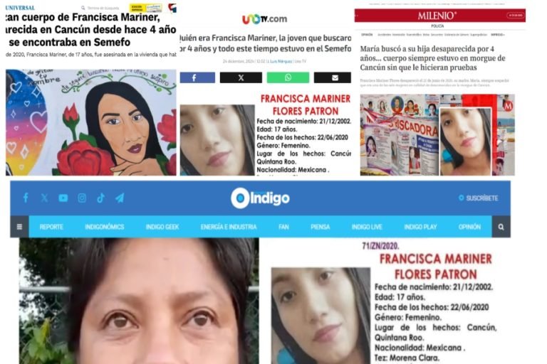 El cuerpo de Francisca Mariner fue encontrado un mes después de su desaparición, el 21 de julio de 2020, en un área verde de la Supermanzana 105, en el municipio de Cancún. La causa de su muerte fue determinada como traumatismo craneoencefálico producido por un proyectil de arma de fuego.