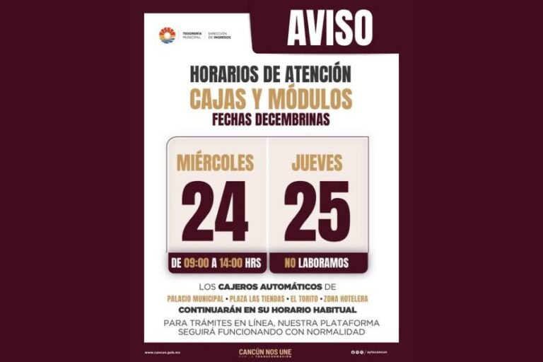 CANCÚN.-Con motivo del asueto por la celebración de Navidad, este jueves 25 de noviembre, la Tesorería Municipal y la Dirección de Ingresos del Ayuntamiento de Benito Juárez, informan a los contribuyentes que se mantendrán cerradas todas sus cajas y módulos, pero estarán disponibles otros mecanismos para el cumplimiento de sus contribuciones.