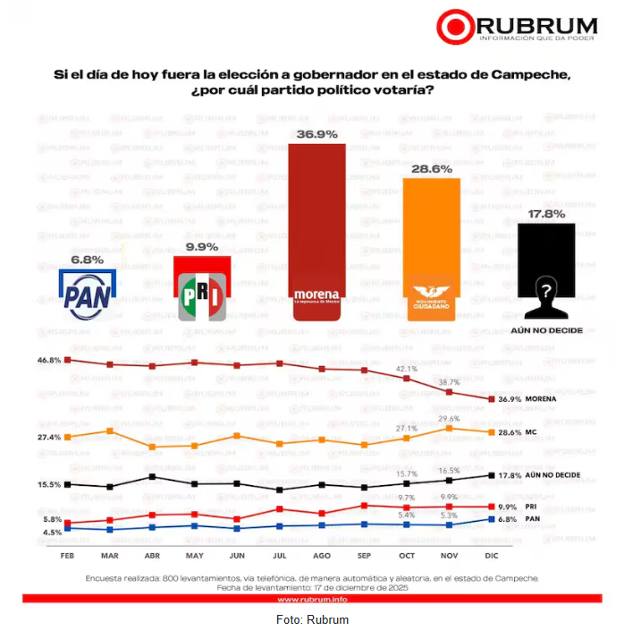 La encuesta fue levantada el 17 de diciembre de 2025, mediante 800 entrevistas telefónicas automatizadas en el estado de Campeche.