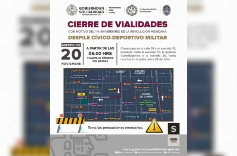 PLAYA DEL CARMEN.- El gobierno de Solidaridad, a través de la Secretaría de Seguridad Ciudadana Municipal, informó del cierre de calles en la ruta del desfile de este 20 de noviembre, a partir de las 05:00 horas y hasta finalizar el evento.