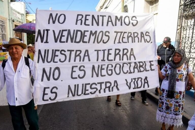 La movilización avanzó por calles del centro de Mérida entre consignas que reflejaban el sentir del contingente: “El territorio no se vende, se ama y se defiende”, “Los mayas unidos jamás serán vencidos”, “No nos van a callar” y “Defender la tierra no es un delito, es un derecho”.
