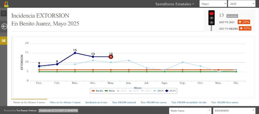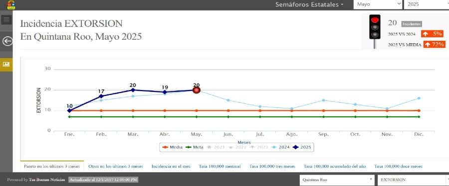 CANCÚN.- En Quintana Roo se han cometido 152 delitos de extorsión al corte del 30 de septiembre, informó el Secretariado Ejecutivo del Sistema Nacional de Seguridad Pública (SESNSP) y el Semáforo Delictivo del Estado señala que, de ese total, 114 casos corresponden a Benito Juárez (Cancún), es decir, el 75 por ciento de este delito se cometen en la ciudad.