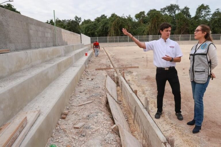 ISLA MUJERES.- Como parte del compromiso de fortalecer la infraestructura deportiva y social en Ciudad Mujeres, la presidenta municipal, Atenea Gómez Ricalde, supervisó de manera directa los avances de la construcción de la primera cancha de fútbol 7 en la historia de la Zona Continental, una obra emblemática que se edifica en la colonia La Loma.