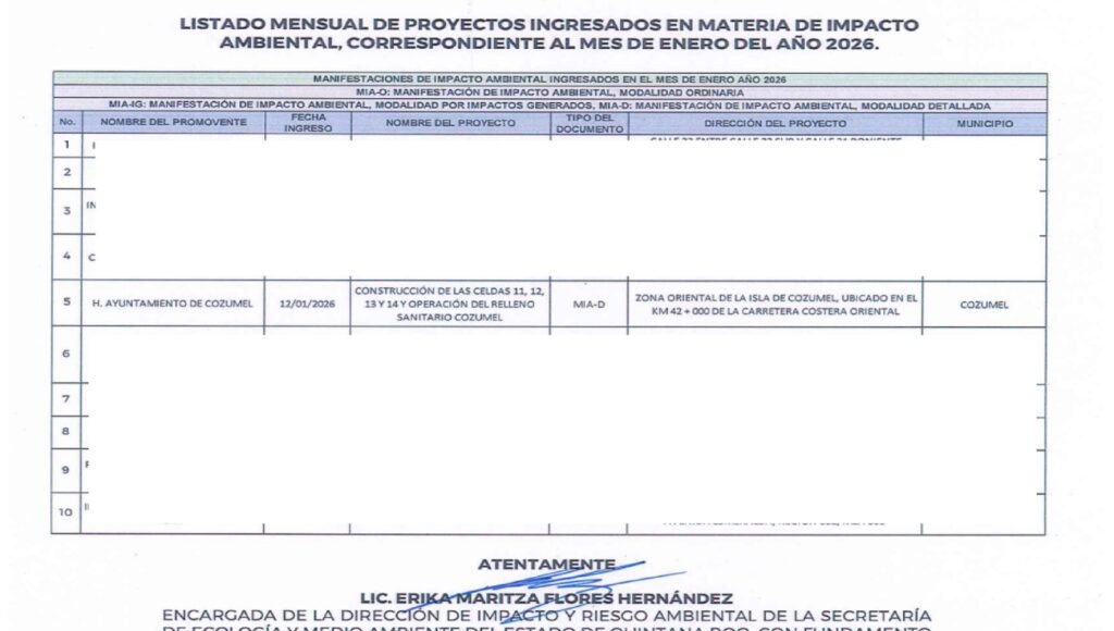COZUMEL.- El Ayuntamiento de Cozumel, que preside José Luis Chacón Méndez, solicitó ante la Secretaría del Medio Ambiente (Sema) de Quintana Roo, la Manifestación de Impacto Ambiental (MIA) para la “construcción de las celdas 11, 12, 13 y 14 y operación del relleno sanitario”, ubicado en la zona Oriental de la Isla, kilómetro 42 de la carretera costera.