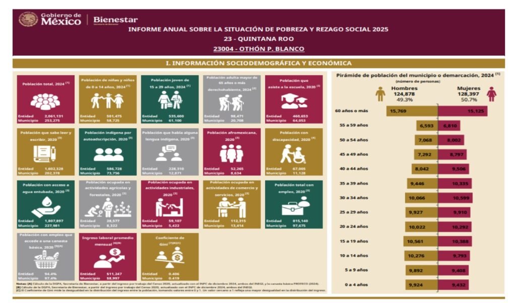 En ese contexto, la Secretaría del Bienestar (Sebien) del Gobierno de México, publicó su Informe Anual Sobre la Situación de Pobreza y Rezago Social 2025, donde destaca que en Othón P. Blanco no hay avances para combatir este flagelo social, pues en 2023, 105 mil 190 personas (43.8 por ciento) estaban en condiciones de pobreza y en 2025 el porcentaje es similar con una población de 105 mil 193 que la padecen.