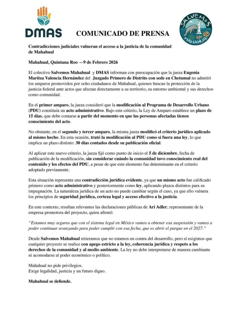 De acuerdo con el colectivo Salvemos Mahahual y la organización DMAS, una jueza federal no admitió los amparos promovidos por ocho ciudadanos de la comunidad, quienes buscaban frenar actos que consideran afectan su territorio y el entorno ambiental.