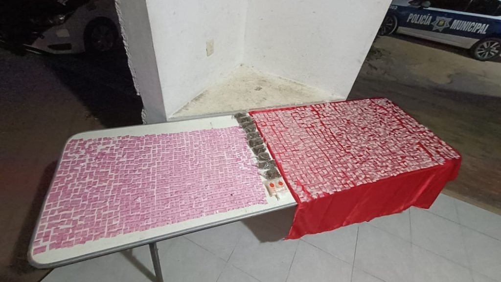 Durante la revisión, los elementos policiacos aseguraron bolsas con cocaína y marihuana, además de un total de 889 envoltorios con «piedra» y 1000 grapas con «cristal«.