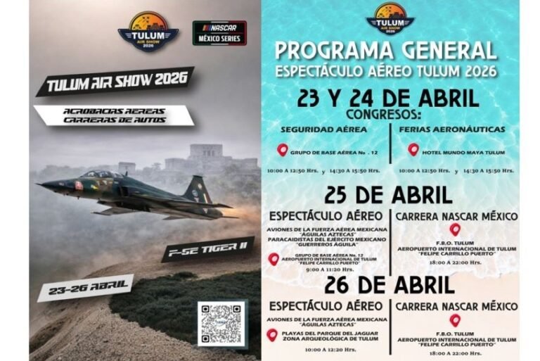 El espectáculo aéreo abierto al público en general, será el sábado 25 de abril, en la Base Militar del Aeropuerto Internacional de Tulum “Felipe Carrillo Puerto”, donde participarán las aeronaves de la Fuerza Aérea Mexicana “Águilas Aztecas”; así como los paracaidistas del Ejército Mexicano “Guerreros Águila”; el horario será de las 09:00 a las 11:20 horas.