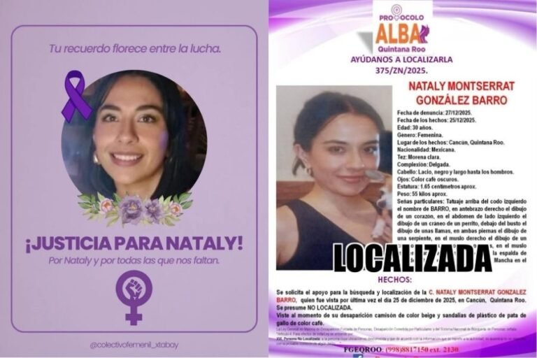 A través de comunicados y publicaciones, señalaron que el caso de Nataly Monserrat refleja un patrón que se repite en Quintana Roo: mujeres que desaparecen y son localizadas sin vida días después, mientras las investigaciones avanzan con lentitud y sin información clara para las familias.