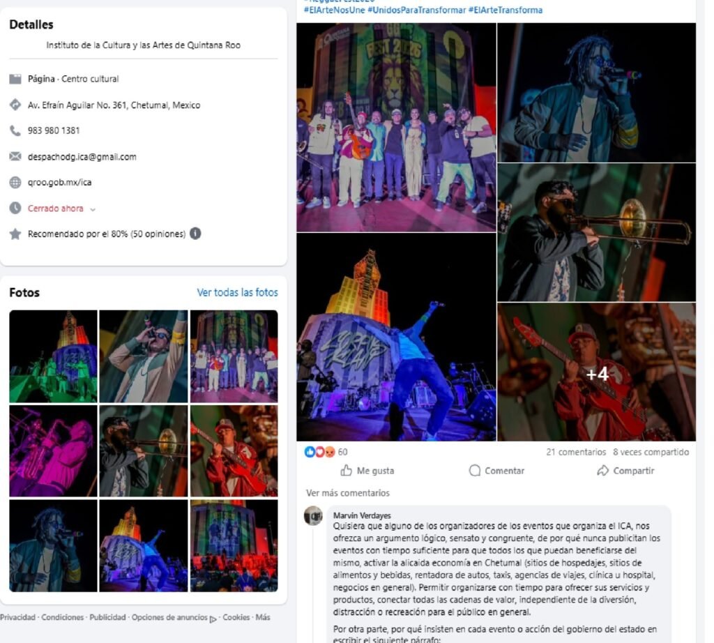 En la página de Facebook del ICA, Marvin Verdayes abre la conversación al solicitar mejor organización de los eventos del Instituto; “quisiera que alguno de los organizadores de los eventos que organiza el ICA, nos ofrezca un argumento lógico, sensato y congruente, de por qué nunca publicitan los eventos con tiempo suficiente para que todos los que puedan beneficiarse del mismo, activar la alicaída economía en Chetumal (sitios de hospedajes, sitios de alimentos y bebidas, rentadoras de autos, taxis, agencias de viajes, clínica u hospital, negocios en general). Permitir organizarse con tiempo para ofrecer sus servicios y productos, conectar todas las cadenas de valor, independiente de la diversión, distracción o recreación para el público en general”.