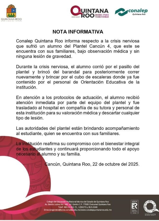 CANCÚN.- Conalep Quintana Roo informó esta tarde que el incidente registrado hoy en el Plantel Cancún 4 se trató de una crisis nerviosa sufrida por un estudiante, quien ya se encuentra bajo observación médica.