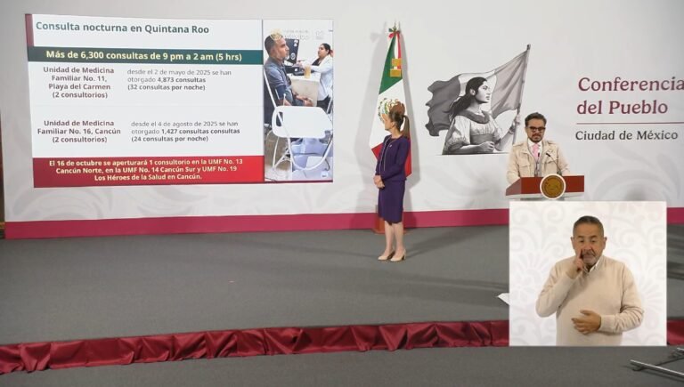 Durante la conferencia “La Mañanera del Pueblo”, el director del Instituto Mexicanos del Seguro Social (IMSS), Zoé Robledo Aburto, destacó que fue en las unidades de medicina familiar de Cancún y Playa del Carmen donde iniciaron con el proyecto de dar consultas nocturnas, como una respuesta a la atención de los trabajadores del turismo.