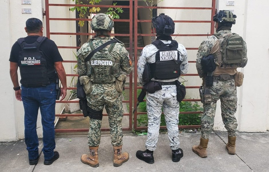 CANCÚN—Personal de la Fiscalía General del Estado, en coordinación con elementos de la Defensa, Guardia Nacional, Secretaría de Marina, Policía Estatal y Policía Municipal, cumplimentó cinco órdenes de cateo giradas por jueces de control. Los agentes participantes aseguraron posibles estupefacientes, motocicletas y cartuchos útiles. Además, lograron la detención en flagrancia de dos personas, por su presunta relación en hechos probablemente constitutivos de delitos contra la salud en su modalidad de narcomenudeo.