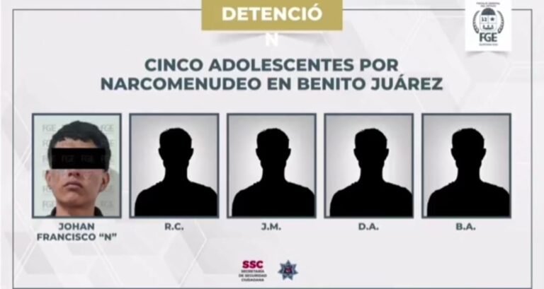 Los detenidos fueron identificados como Johan Francisco “N”, de 19 años y originario de Quintana Roo; Roberto Carlos “N”, de 17 años, originario de Tabasco; Jesús Martín “N”, de 16 años, Daniel Alejandro “N”, de 15 años, y Brandon Alonso “N”, de 15 años, estos últimos originarios de Quintana Roo.