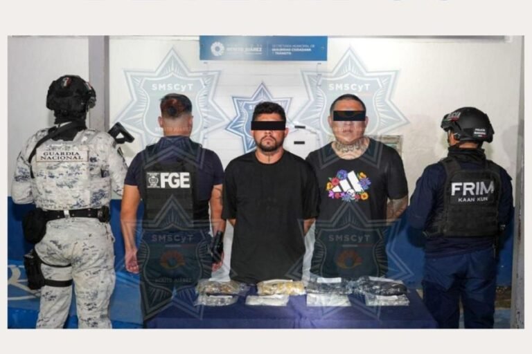 CANCÚN.– Como parte del operativo Blindaje Cancún, autoridades de los tres niveles de gobierno lograron la detención de dos hombres presuntamente dedicados a la venta de drogas en la Supermanzana 260.