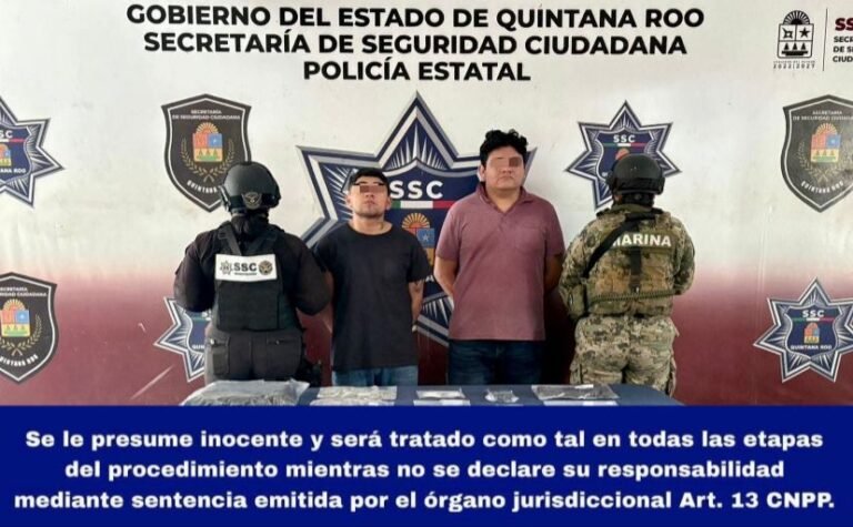 CANCÚN.- Dos hombres fueron detenidos por su presunta participación en delitos contra la salud durante un operativo de prevención realizado en el fraccionamiento Gran Santa Fe 3.