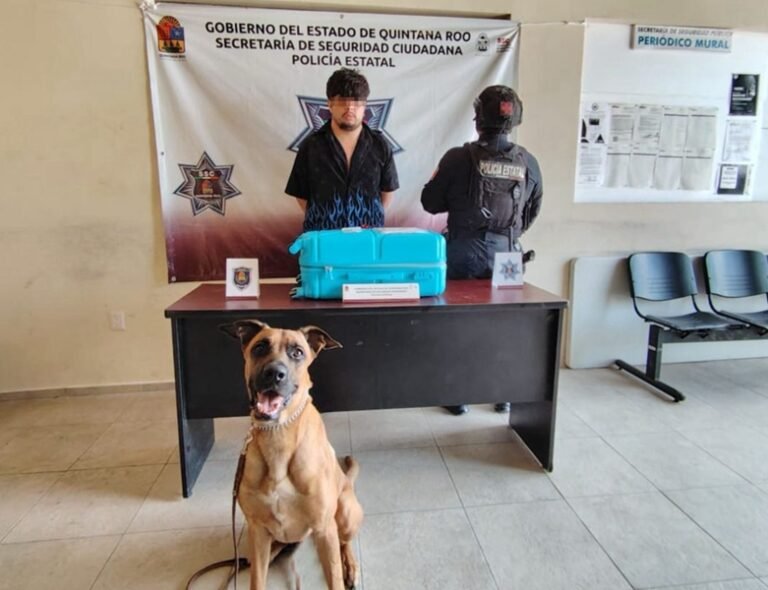 TULUM.- Elementos del Grupo Canino K-9 de la Secretaría de Seguridad Ciudadana, detuvieron a un hombre identificado como Mauricio “N”, presunto implicado en delitos contra la salud, luego de que se le asegurara una maleta que contenía droga durante una inspección en la central de autobuses ADO.