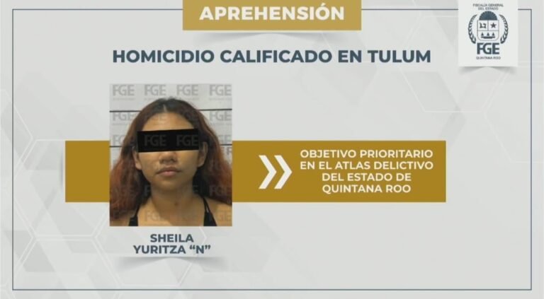 Se trata de Sheila Yuritsa “N”, quien fue capturada por elementos de la Policía de Investigación de la Fiscalía General del Estado en cumplimiento de una orden de aprehensión, por su probable responsabilidad en el homicidio de un hombre ocurrido en el municipio de Tulum.