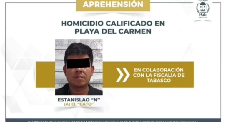 PLAYA DEL CARMEN.— Elementos de la Policía de Investigación de la Fiscalía General del Estado, en coordinación con autoridades de Tabasco, cumplimentaron una orden de aprehensión en la ciudad de Villahermosa contra un hombre identificado como Estanislao “N”, alias “El Gato”, por su probable participación en un doble homicidio ocurrido en Playa del Carmen.