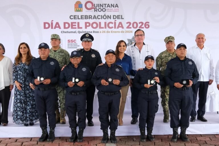 CHETUMAL.- El Gobierno de Quintana Roo conmemoró el Día de las y los Policías con la entrega de reconocimientos y ascensos a elementos de diversas corporaciones, en un acto encabezado por la Gobernadora Mara Lezama Espinosa, quien reiteró el respaldo institucional a las fuerzas de seguridad del estado.