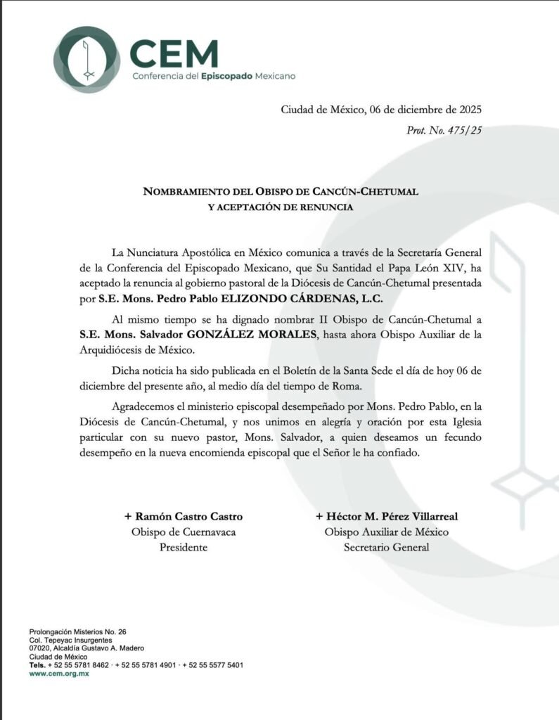El relevo eclesiástico fue informado a través de un comunicado breve de la Diócesis sin detallar los motivos de la dimisión de Elizondo, quien encabezó la estructura católica en Quintana Roo durante 21 años.