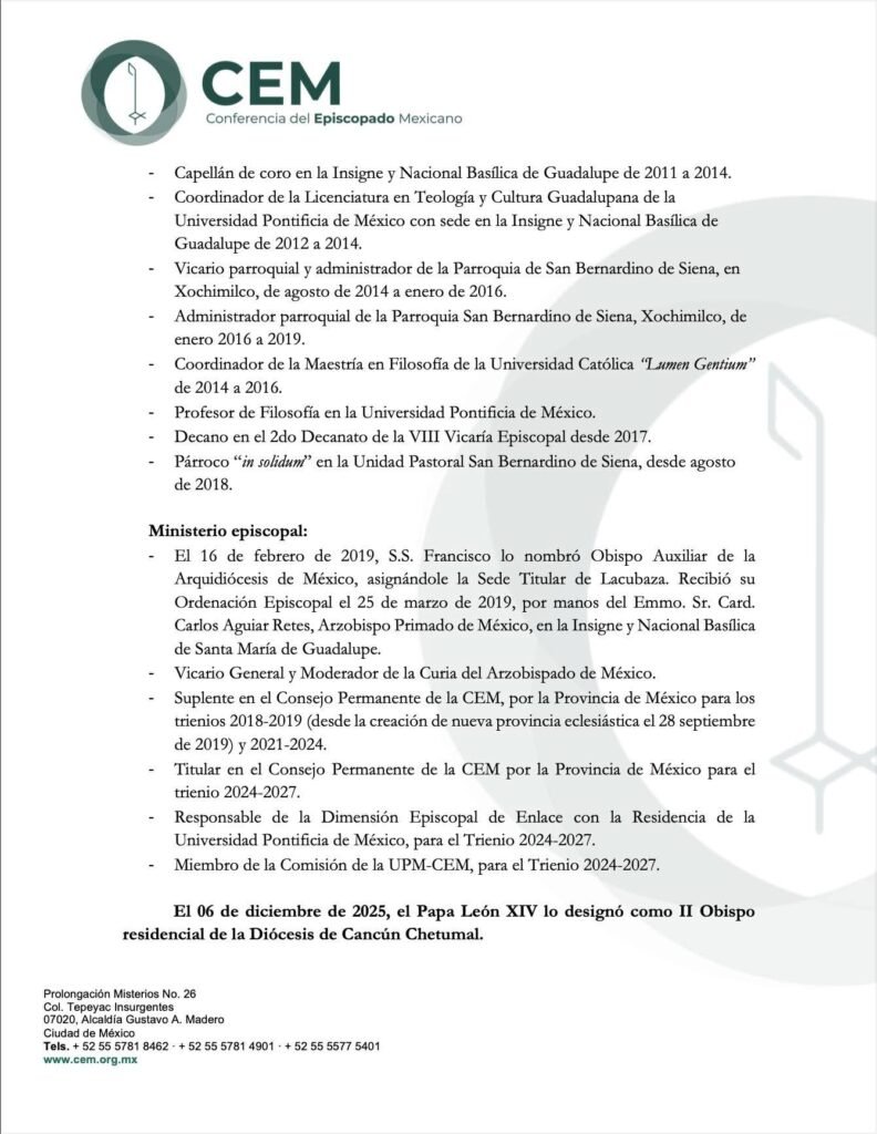 La Conferencia del Episcopado Mexicano también expresó agradecimiento a Elizondo Cárdenas, integrante de los Legionarios de Cristo, por su ministerio en la diócesis.