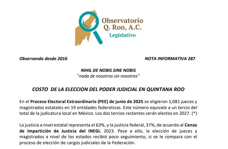 Quintana Roo se colocó en el quinto lugar nacional en cuanto a los estados que otorgaron mayor monto presupuestal al proceso de elección del Poder Judicial, considerando el costo por cada cargo que estuvo en juego, de acuerdo al análisis del Observatorio Legislativo en su boletín #287 fechado este 10 de noviembre.