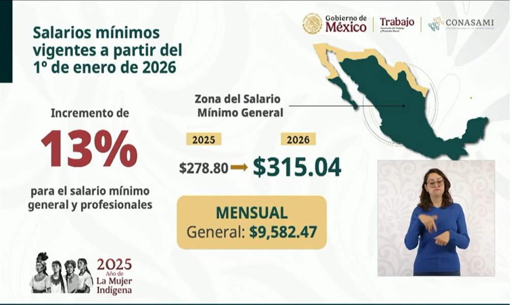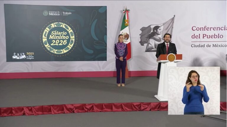 CIUDAD DE MÉXICO.– El aumento al salario mínimo general para 2026 quedó fijado en 13%, con lo que el ingreso mensual pasará a 9 mil 582.47 pesos, informó este miércoles la presidenta Claudia Sheinbaum Pardo durante su conferencia matutina.