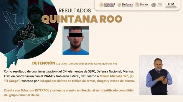 CIUDAD DE MÉXICO.- En La Mañanera de este 11 de noviembre, el secretario de Seguridad y Protección Ciudadana, Omar García Harfuch, informó que se logró la detención en Cancún del narcotraficante europeo, Mikael Michalis «N» alias «El Griego».